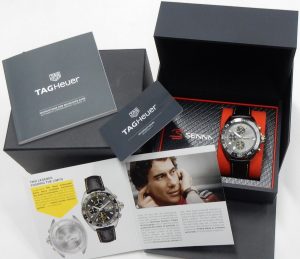 This Senna Edition F1 chronograph is our latest estate watch and one of the last to pay homage to the Link series of Tag Heuer watches. Aryton wore many Tag Heuer watches and more often than not they were one of various S/el (Sports Elegance) models (later renamed “Link”). This rare Senna Edition CAZ201B is seldom seen with yellow highlights on the dial, bezel, crown, start/stop button, and strap stitching. In keeping with the unique bracelet pattern of the original S/el and Link models, this watch features the same pattern embossed on to the black leather strap.
