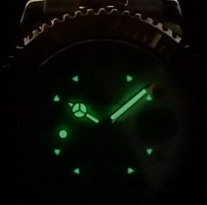 When we first saw this dial we thought is was very odd and impractical with its black hour markers. In the dark it all makes sense as small triangular luminous plots ensure excellent visibility when the lights go out.