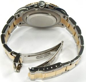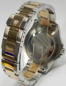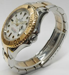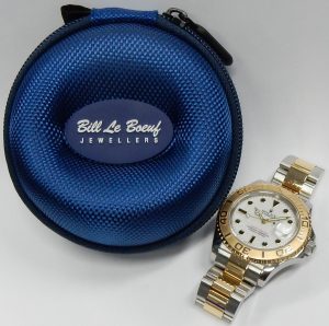 If you have a larger wrist we’ll need to get a link or two for you. It does not come with any original documentation of packaging. Bill Le Boeuf Jewellers includes a one year warranty covering all aspects of the watch the same as Rolex. Before this model was retired it carried a retail price of $12,600.00 USD. A current model two-tone (rose gold/steel) 40mm Yacht-Master comes with a retail price of $22,650.00 CAD. Our example is estate priced at $14,500.00 CAD. Stock #505-00629.
