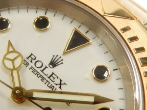 For those not familiar with Rolex sports models, the Yacht-Master can be confused with a Submariner. The confusion is easy to understand as both watches are the same size (from this era), have a rotating bezel indexed for 60 minutes, have the large super water tight triplock crowns, large luminous dial markers with the same style hands. Where they differ is the Yacht-Master is a little less narrowly focused in design. A totally polished case and solid 18 karat yellow gold bezel give it a more dressy jewellery look. The lugs of the Yacht-Master turn down more and aren’t as sharp, making for an unquestionably more comfortable watch.