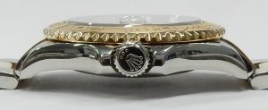 Even in complete darkness, the “invisible by day, luminous by night” markers phosphoresce brightly. The clean white dial is far more subtle than the bright royal blue face found on a two tone Submariner. A splash of red text is applied so thick it actually shows height. This example is 18 years old, but it looks like new. It shows almost no evidence of use, even on the diabolically difficult to refinish sandblasted/polished bezel.