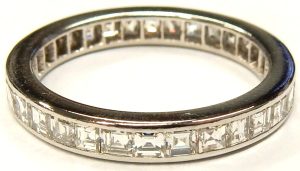 “Anniversary rings” are some of the most versatile designs around, and they don’t need to be reserved for a special anniversary. The flat edge allows them the fit flush with many different rings. They can be used in front or behind your existing wedding/engagement set, they look look great when stacked up against a plain wedding ring other flat edged design. We get a steady supply of anniversary style rings, most featuring a string of channel or prong set round diamond across the top and shoulders. Few anniversary rings have diamonds set around the entire circumference, fewer still feature anything other than round brilliant cut diamonds. Our latest anniversary ring is a full eternity design showcasing an endless row of square baguette step cut diamonds elegantly channel set in an uninterrupted string of high quality sparkle. The 32 diamonds are of VS-GH quality and measure 2mm x 2mm. The ring only measures 2.75mm in width, so pretty much all you see are the twinkling natural diamonds.