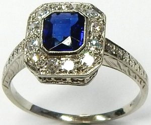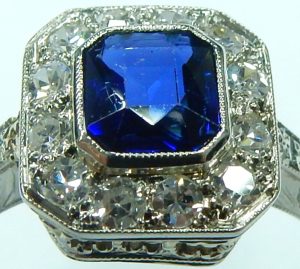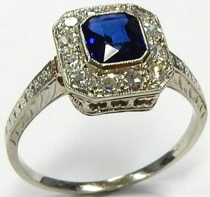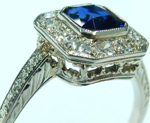 Sapphires are very tough but after decades of use we often see them with numerous scratches, chips, and worn facets, but that’s not the case with this one. The sapphire is surrounded by 12 round single cut diamonds of high quality (VS-G) all with excellent cut. The fine milgrain bezel and halo border still show excellent detail suggesting this ring was carefully worn throughout its life. The pierced gallery, and hand engraved flower blossom/leaf shoulders show very good relief and detail.
