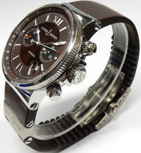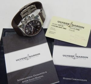 They have a background dating back to the mid 1800s. The company was famous for building some of the world’s most accurate marine chronometers. Before there was electronic timing equipment these highly accurate wind up timekeepers were an essential tool for celestial navigation on the open sea. Accuracy wasn’t a luxury, it was a life or death necessity. Before the digital world of GPS positioning, knowing where you were relied on precise time, a clear star filled sky, a sextant and a good deal of operator skill. Developing incredibly accurate ship clocks was a daunting task given the environment they operated in. Accurate time was an essential factor for knowing where you were in the vast open oceans. In keeping with their nautical timing history the Ulysse Nardin Marine Chronometer 353-66 offers all the features one would expect from a rugged and durable watch. Super sturdy stainless case offering water resistance to over 600 feet.