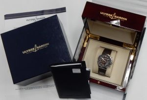 It’s working great, keeping excellent time with all functions working as designed. Bill Le Boeuf Jewellers will provide the new owner a complimentary 1-year warranty covering all aspects of mechanical failure and defects. The current version of this watch has the familiar Mariner look but is a bit larger at 43mm, comes with a calendar that only needs reset once per year and comes with a €13,600.00 ($21,900.00 CAD). Our estate price for this classic Ulysse Nardin is $5,900.00 CAD. Stock #501-00418.