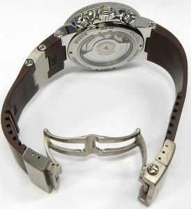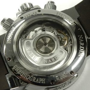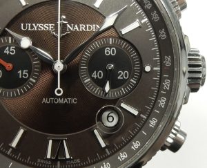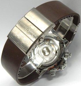 The tiny date aperture cut into the dial is magnified with a lens affixed to the inside of the crystal making the date appear larger than it is. This feature is not unlike the Rolex Cyclops magnification lens but executed in a much more subtle way. The beautifully manufactured 57 jewel ETA 2892-A2 that has been modified to Ulysse Nardin specification with chronograph module is visible through a transparent lab-grown sapphire case back window.