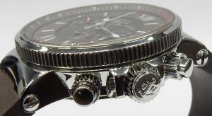 Threaded crown and chronograph pushers screw into the case ensuring moisture stays out and the time or chronograph can’t accidentally be changed/stopped. The beautiful concentric ring and matt finish chocolate brown dial with luminous hands and markers is in itself a small work of art.