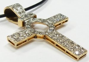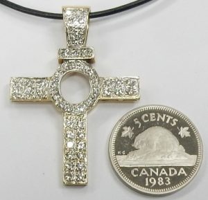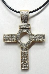 We’re not sure if this cross with its circular hole is some sort of Celtic cross interpretation or it has some other meaning. What we do now is that it is completely hand fabricated (not cast) from multiple pieces of yellow gold all soldered together. The 47 round brilliant cut diamonds that decorate the entire top surface have been bead set by hand with rhodium plating to further enhance their sparkle. We conservatively estimate the total diamond weight at 0.75 carat of SI2-I1 clarity and JK colour. The cross measures 42.7mm x 29.9mm.
