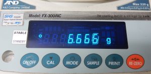 After a thorough cleaning for a few hours in our high temperature ultrasonic cleaner we were surprised to measure the total weight at 6.666 grams.