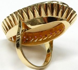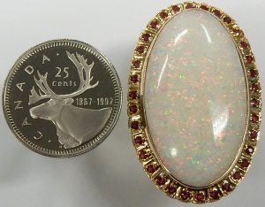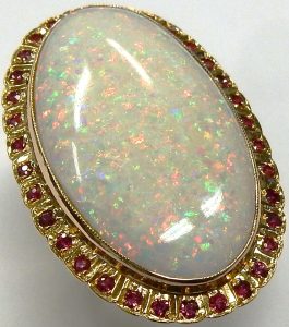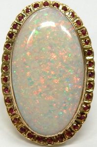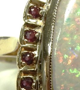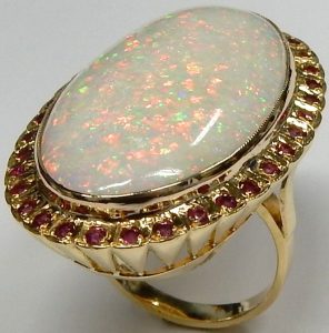 The depth is more than enough to provide adequate strength but not so deep as to add useless additional weight. What you get with this one of a kind ring is a genuine rainbow coloured party on your finger. The cabochon cut opal is bezel set with a complete frame of gold to protect the gem’s edges. If a 23 carat opal isn’t enough, it has been embellished with 34 round faceted natural rubies measuring 1.8mm diameter. The bright red accents add a further 1.00 carat of gem weight to this over the top dinner ring.