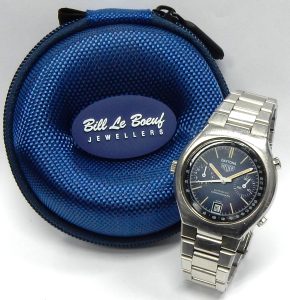 Forget about wearing it under a long sleeve shirt. It’s a great conversation piece and a watch you’re not likely to encounter on any other wrist. We are happy to provide the next owner with a complimentary 1-year warranty. This important watch is estate priced at $5,000.00 CAD. Stock #510-00220.