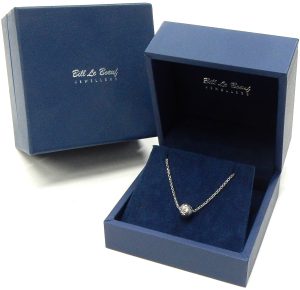 It’s not always the complex elaborate designs that catch our eye when it comes to a piece of jewellery for our Vintage Spotlight. We certainly didn’t plan on this simple ball pendant to showcase but there is something about it that grabs your attention. The highly polished and bright-cut sphere sparkles like the world’s tiniest disco ball. No front or back to the sliding rolling pendant, just a 7.8mm ball machine engraved with incredible precision. Each of the flat surfaces twinkles with the slightest movement. The 18 inch rolo style necklace also has been given the bright-cut treatment as each link has 4 microscopic flat beveled sections. They are imperceptible individually, but collectively they add to the overall visual impact. Of course a precisely manufactured item like this was crafted in Italy. The necklace is secured by a sturdy lobster clasp. This item is in like new condition and has never been polished, the factory applied rhodium finish is fully intact. The pierced ball pendant slides effortless over the rounded links and will always stay perfectly centred. Add some effortless sparkle to you day with this necklace/pendant set for the estate price of $720.00 CAD. Stock #436-00299.