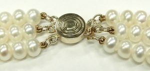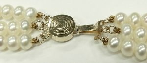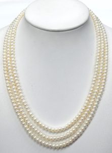 There is nothing more sophisticated than a simple choker length pearl necklace with small beads. Turn that simple elegant single strand into a triple and now it’s a statement piece. This triple strand of uniform size freshwater pearls measures 16-17 inches in length and contains upwards of 350 individual cultured pearls. Each pearl measures 4.5mm to 5.0mm in diameter and exhibits excellent luster with a good coating of fine grain nacre. They are strung on traditional white silk cord and attached to a 14 karat yellow gold, 8mm triple strand clasp with built in safety.