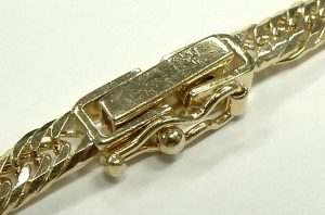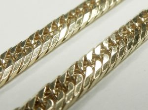 This clasp is an expensive upgrade that needs to be hand installed and adjusted. The solid link construction is something we’re seeing less and less of all the time too. Even in 10 and 14 karat, hollow is the manufacturers answer to rising gold prices. The super tight double curb link design is smooth and silky looking, like a flat herringbone chain but with the durability of an open link design. A polished and bevelled edge adds an extra design detail and sparkle.