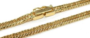 Too bad you can’t buy a good used car for 39% more than its metal content. Once your car is totally worn out it is only worth $250.00 to $300.00 per ton!!! “The trend is your friend”, gold continues to escalate in value almost every day. If we could only go back in time 20 years and load up on gold when it was trading at $500.00 per ounce; today (Feb. 22, 2025) it is selling for $4,176.00 per ounce. It’s hard to describe this style of chain and I certainly don’t know its name. It consists of yellow gold double wedge shaped links turned 90 degrees on each other connected with white gold circular rings measuring 4mm diameter.