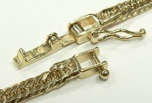 Gold is expensive and a good sized Cuban link requires a lot because these links are tightly packed, thick and solid. The chain measures 7.3mm wide and 2.7mm thick. With dimensions like that this necklace ends up weighing close to 3 ounces at 86 plus grams. A chain of this quality deserves a clasp that’s up to the task of securing a valuable piece of jewellery. The large over-sized plunger, box clasp comes equipped with 2 side safeties; it’s like wearing suspenders and a belt to keep your pants up.
