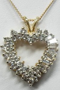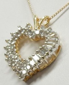 Never one to pass up a retro piece, we were pretty excited about this heart pendant! Baguettes, yellow gold, and a diamond-encrusted wreath layout; really, how can you not appreciate its bold glam! This 22.8mm x 18.2mm heart pendant is a blast from the past. The 4.3 gram 10 karat pendant runs its 0.33 carats total weight of I2-JK diamonds on a rollercoaster, dropping from 5.3mm tall to 2.9mm around the heart-shaped track. The pendant hangs from an 18 inch long curb-link chain with a spring-ring catch, 4.3 grams total weight. Estate price $300.00 CAD. Stock #e14115.