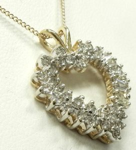 It’s not too late to be a Valentine’s Day hero. Heart shaped jewellery has been around forever and they are always consistent sellers in our estate department. This traditional diamond frame design offers a slight style tweak with some tapered baguette cut diamonds interrupting the double row of round brilliant cut diamonds. The diamonds are set in a rising/falling wave pattern around the frame showcasing a continuous change in height around the circumference adding some visual interest.