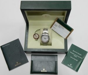 The hang tags, endorsed warranty card, inner/outer boxes, booklets, instructions, wallets, protective white cardboard sleeve, soft foam box liner and even a copy of the original bill of sale from the authorized Rolex agent that sold the watch are all included with purchase.