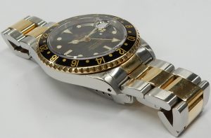 The 18 karat gold centre links are much heavier, and the buckle is no longer a simple interference lock. The mechanical spring-loaded lock offers more security and sophistication. The “easylink” extension offers the ability to easily extend the length by about 5mm without any tools.