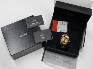 A champagne dial divers watch is a little usual and we love it. Almost every diver watch comes with a black , blue, or sometimes white face. The sunburst champagne on this Tudor is a sophisticated mature look that really grows on you. The yellow trim of the bezel, crown, and bracelet enhances the luxury look, but this still performs as a serious divers tool. Once we saw this combination in person we quickly changed our opinion of what a divers watch could look like.