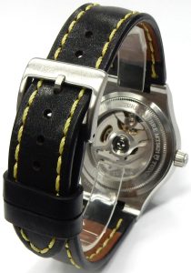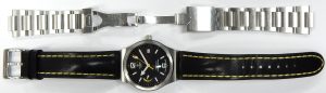 This example is a very early model as it was delivered to the original owner in the fall of 2015. It comes fully documented with the original bill of sale, fully endorsed warranty card, instructions, document holder, inner/outer boxes, and a white cardboard sleeve. The watch comes with a high quality aftermarket TSS black leather strap with yellow stitching than blends well with the yellow accents on the dial.