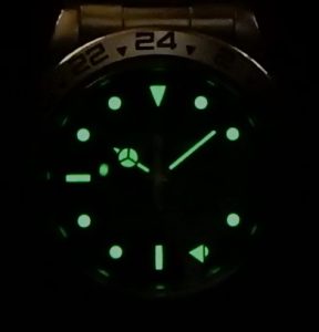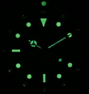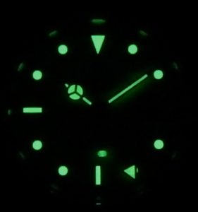 The luminous material used on the hands, hour markers, and bezel “zero” index was upgraded from tritium to luminova. This newer glowing pigment provides a brighter glow, won’t discolour over the years, and will continue to glow long after the 20-25 year service life of tritium.