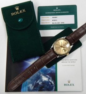We didn’t open the case back to be sure but we’re pretty confident this was the first service given to the 20 year old Rolex. The interesting two-tone dial is known in Rolex circles as the Tuxedo. It is very subtle, adding a new dimension to the classic look. This dial is quite rare and no longer offered. The “roulette” date display alternates with red text on odd days and black on the even days.