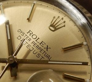 A true Rolex aficionado may take it a step further and recognize the unusual dial with a connected minute track and raised hour markers. The raised hour markers allow Rolex’ watchmakers to secure the solid 18 karat gold markers over the perfected placed domed tritium plots. These markers are seldom seen with the single rail minute track.