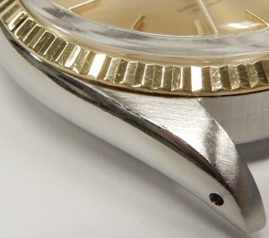There are numerous scuffs and scratches on the case and bracelet. We’ve decided to leave it in its original condition. If you’d like it fully refinished, one of our highly skilled goldsmiths can refresh the polished and brushed textures back to like new for $150.00.