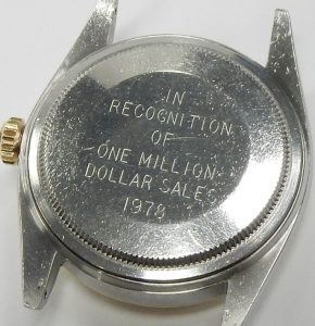 A million dollars is a lot of money, but it was a whole lot more significant 47 years ago. In the late 70s a million dollars would have bought 10 really nice houses in Barrie. Included with the purchase is a one-year Bill Le Boeuf Jewellers warranty and a never worn Hirsch brown leather strap (the watch does not come with an original Rolex bracelet). The engraving on the case back can easily be removed but we like to keep these collectible watches original as it’s part of their story. Rolex still manufacture a 36mm Datejust that looks almost identical to this one on a gold and stainless steel bracelet. The current version of this iconic watch 126233 carries a retail price of $18,200.00 at your local Rolex boutique. Our late 1970s vintage example is estate priced at $6,000.00 CAD. Stock #505-00630.