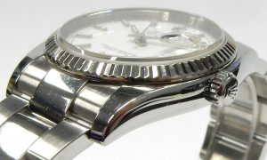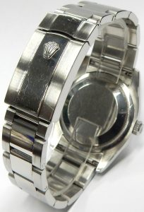 Looking at the current version of this model, the white gold diamond bezel is a $6,150.00 upgrade over the basic model. Adding the beautiful diamond set hour marker at 6:00 o’clock costs an additional $2,000.00 bringing the replacement price to $17,400.00. The rest of the features of this slightly smaller Oyster Perpetual are the same as its big brothers. Fully automatic self winding movement is guaranteed accurate to within certified chronometer tolerances or just a few seconds per day. The Oyster case is watertight to 100 meters thanks to its screw down crown, screwed on case back, and the high pressure fit nylon gasket securing the lab-grown sapphire crystal.