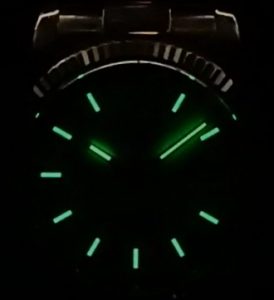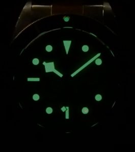 A retro looking burnt orange sixty minute one way timer bezel is a necessity for any diver watch. It turns easily and indexes 60 times per full rotation with a satisfying audible ratcheting clicks. In the dark or low light situations the luminous hands and hour markers glow effectively.