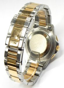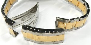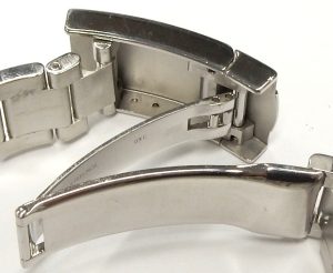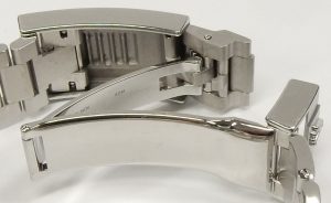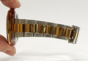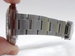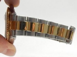 The 18 karat gold centre links are much heavier, and the buckle is no longer a simple interference lock. The mechanical spring-loaded lock offers more security and sophistication. The “easylink” extension offers the ability to easily extend the length by about 5mm without any tools.