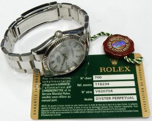 The hang tags, endorsed warranty card, inner/outer boxes, booklets, instructions, wallets, protective white cardboard sleeve, soft foam box liner and even a copy of the original bill of sale from the authorized Rolex agent that sold the watch are all included with purchase.