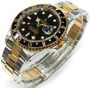 Every Rolex is collectible to a degree, some more so than others. What distinguishes the most collectible are not only the uncommon and rare models but also their story and history. The history of the GMT is a notable one that goes back to the 1950s. High speed long distance air travel was becoming the norm and pilots travelling across multiple time zones in a single trip was common place. They needed a watch that could keep track of a worldwide standardized time plus the local time of where they currently were. Greenwich Mean Time (GMT) was adopted as the constant. This “universal” time is displayed by the long thin arrow style 2nd hour hand on the watch and displays hours on the all black outer bezel in a 24 hour format.