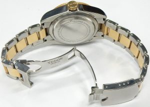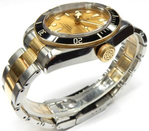 A champagne dial divers watch is a little usual and we love it. Almost every diver watch comes with a black , blue, or sometimes white face. The sunburst champagne on this Tudor is a sophisticated mature look that really grows on you. The yellow trim of the bezel, crown, and bracelet enhances the luxury look, but this still performs as a serious divers tool. Once we saw this combination in person we quickly changed our opinion of what a divers watch could look like.