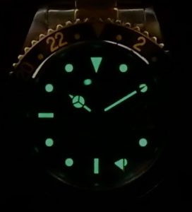 With with vintage watches, it’s all about the dial; and this one is perfect. There is not the slightest stain or blemish to the champagne sunburst finish. Every tritium hour plot is also perfect showing no parchment patina with perfectly matching 18 karat yellow gold hands.
