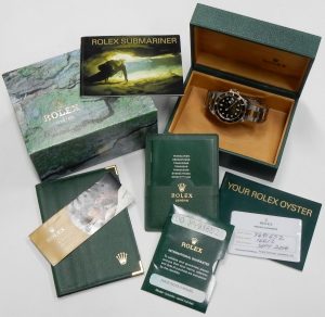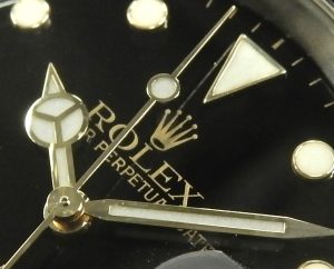 We always prefer leaving these collectible watches in as presented condition; they can be refinished over and over but they’re only original once. It is even more important to leave this complete example in original condition as it is now been retired from the Rolex line up. I can make a pretty good case for this watch eventually becoming more valuable than the otherwise identical date-equipped model. The simple fact is basic Submariner is quite a bit rarer than the date display model. In our estimation, Rolex sold around 1 of these for every 3 of the calendar versions. The no-date Submariner is how it all started way back in 1953.