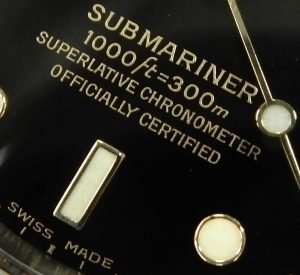 Only Rolex can say for sure when they changed from 2 lines of text to 4 lines but they aren’t talking. For well over 50 years the basic Rolex Submariner dial was clean and simple, with no date display, and no additional SUPERLATIVE CHRONOMETER OFFICIALLY CERTIFIED text. Including our 1 year complimentary warranty, this desirable Rolex Submariner shouldn’t last long for the estate priced of $12,500.00 CAD. Stock #505-00386.
