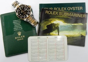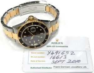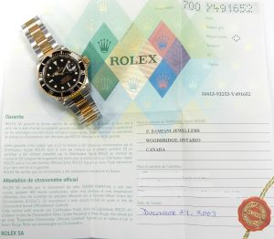There is a lot going for this classic two-tone Rolex Submariner. Here’s the short list: 1 owner, Canadian delivery in Ontario at authorized Rolex agent, original bill of sale, Rolex service warranty card from 2010, complete set with inner/outer boxes, documents, endorsed warranty card, and booklets.