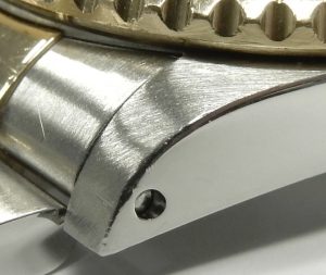 This is one of the last years or may be the last year to use the fully drilled lugs. Fully drilled lugs make for super easy bracelet removal and allow the traditional no flange spring bars to fully extend into the lug offering the ultimate in security. We’ve never seen a failure with the newer style, but if you saw how shallow the spring bars extend into the lug on the solid lug versions you’d understand why this method is tougher.