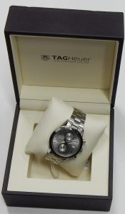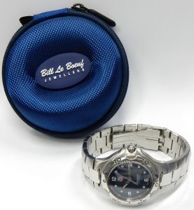If you have a larger wrist we’ll need to order an extra link or two as this one is missing a few of the original removable links. There is a lot of value in a previously enjoyed Carrera. An entry level contemporary Carrera as seen on the Tag Heuer website comes with a price of $6,200.00 CAD. Complete with a 1 year Bill Le Boeuf Jewellers warranty our estate Carrera is estate priced at $1,800.00 CAD. Stock #520-00162.
