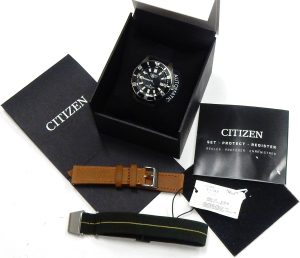 The original strap and buckle have been replaced with a generic replacement. The 20mm lug width allows a large variety of choices for different straps. If comes complete with the original inner/outer boxes, endorsed warranty card and product tag showing a retail price of JP¥269,500 Japanese Yen ($2,400.00 CAD).