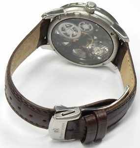 The watch is running well with all functions operating as designed. Comes complete with its original inner/outer boxes, documents, product tags, warranty card (not dated or endorsed), and a never used polishing cloth. The plastic “Masterpiece” hang tag features a chrome finish edge patterned after the escape wheel of the movement within this watch.