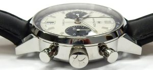 Aside from the simple 30-minute chronograph and big date calendar, the only other feature of the vintage looking dial is a telemeter scale on the chapter ring. This simple analog tool allows the user to calculate the distance of an event based on sight and sound over a period of time. This scale measures the distance of an event based on sound ranging from 1 kilometer to 20 kilometers. An example of how this works could be; if you see a lightning flash and hear thunder 9 seconds later, the lightning was 3 kilometers away. Although this is a thoroughly modern watch its classic styling could have come out of any era. The easy to use rectangular chronograph buttons are a pleasure to operate as they interact with the column wheel controlled mechanism.