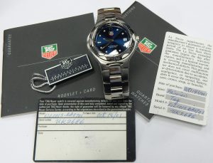 The lab-grown sapphire crystal is perfect, offering flawless optics and viewing of the iridescent mother-of-pearl dial. At 32.5mm in case diameter, model WAF1320 is easy to read but not too big or bulky. Tag Heuer still makes a contemporary version of this watch for $5,300.00 which can be seen on their website. The previous owner had a smaller wrist; if you have a larger wrist we may need to order you an extra link or two.