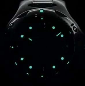 The hands are showing some paint loss and uneven tritium patina. Wearing this watch everyday requires a strong arm as it weighs a substantial 198.6 grams and the case is a 1.5cm thick rectangular chunk.
