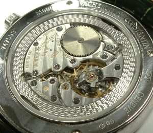 This movement measures less than 4mm in thickness and features an unusual fly-back hacking seconds hand. When the threaded crown is pulled out fully into the setting position the small subsidiary seconds hand at 9:00 o’clock instantly flies back to the 60 seconds position.
