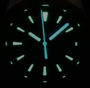 Many watches have luminous hands and markers, but I can’t remember ever seeing a second hand that has been fully treated to luminous material. Not only is it fully lumed, it glows in a blue hue along with the minute hand so they can easily be distinguished from the hour hand.